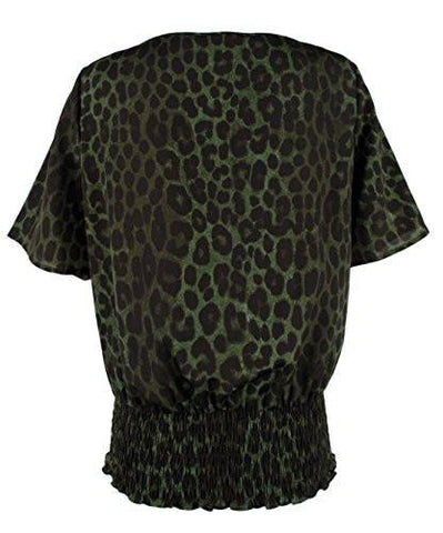 Details: Women's silky cheetah print shirt with a flattering smocked hem. Boatneck. Short sleeves.