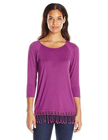 Details: Crochet trim at the hem makes this long sleeve base layer anything but basic. Flattering scoop neck and three quarter length sleeves add to the appeal.